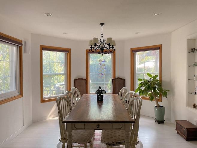 그 다음은 다이닝룸을 소개해드릴게요. 거실 다음으로 좋아하는 이 공간은 창문이 둘러싸고 있고 천장이 높아서 답답함 없이 시간을 보낼 수 있어요.