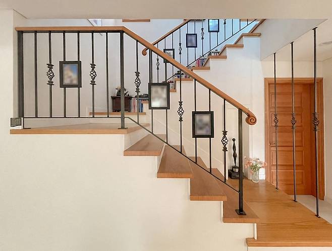 2층으로 이어지는 계단이에요. 워낙 어렸을때부터 가족끼리 여기저기 해외여행을 많이 다니기도 했고, 아버지께서 사진찍는 걸 좋아하셔서 계단 난간에 가족사진을 붙였어요.