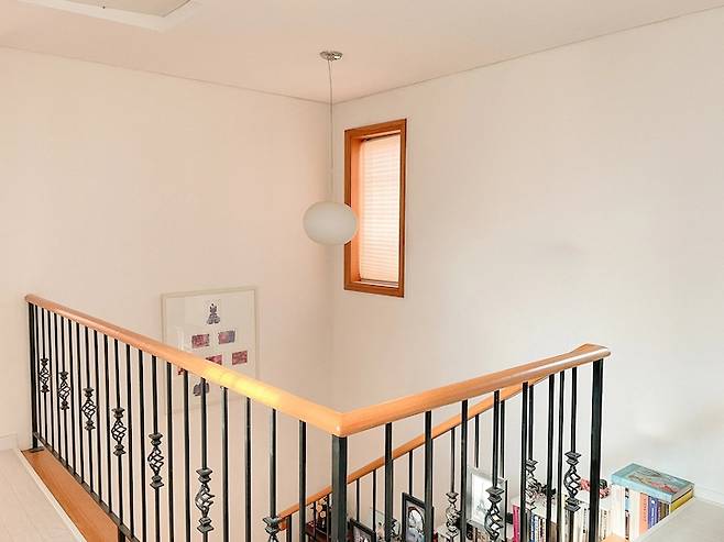 난간과 통일된 컬러로 붙여주어 원래부터 있던 것 같죠! ㅎㅎ 저희 집엔 여기저기 가족사진이 정말 많답니다.