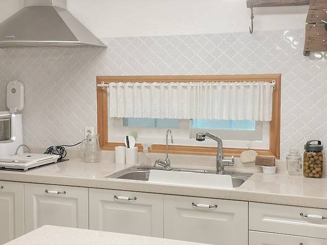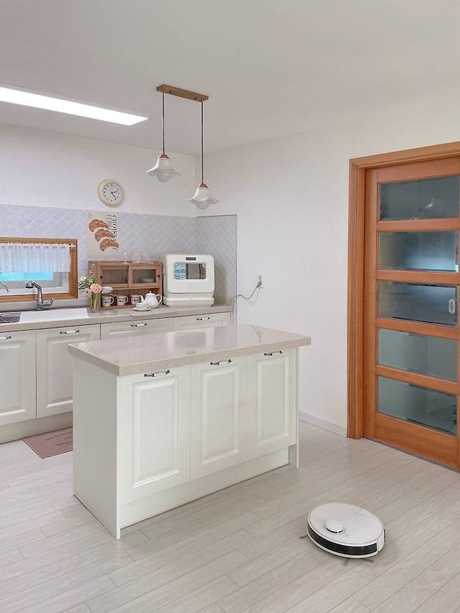 화이트톤의 무드로 꾸민 깔끔한 부엌이에요. 어머니께서 탁 트인 느낌을 원하셔서 상부장 없이 인테리어 했고, 중간에는 아담한 사이즈의 아일랜드 식탁을 배치했어요. 작은 창이 하나 있어서 동화같은 분위기가 느껴지죠:)