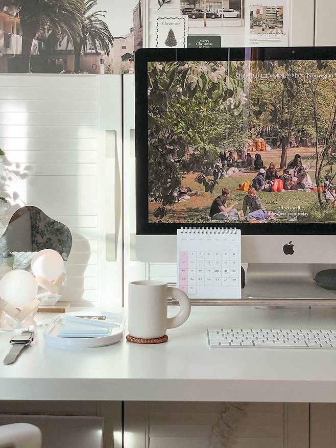 이런저런 소품들이 많아지니 키보드와 트랙 패드가 거슬리기 시작해서 모니터 받침대를 구매했어요. 달력도 놓고, 자주 사용하는 핸드크림도 비치해두었습니다. 제가 정말 잘 쓰는 구글홈 미니 스피커도 모니터 거치대에 잘 올려뒀어요. "헤이 구글, 신나는 노래 틀어줘" 하면 알아서 제가 좋아하는 노래를 틀어줍니다!
