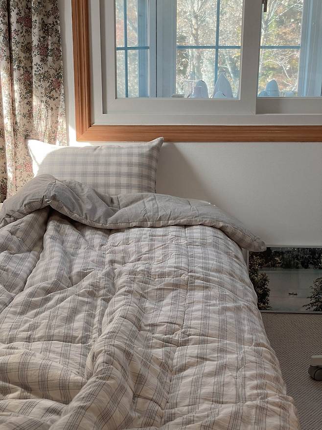 그래서 따뜻한 느낌이 드는 베이지톤의 체크 침구로 바꿔줬어요. 순면이라 너무 보드랍고 폭신해서 만족하는 중이에요. 커텐도 원래 그레이톤의 롱 암막 커튼이었는데 빈티지한 플로럴 패턴의 짧은 커텐으로 바꿔줬어요.