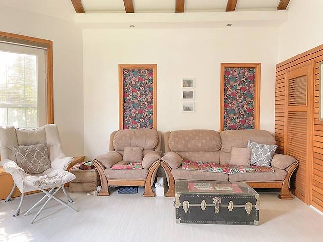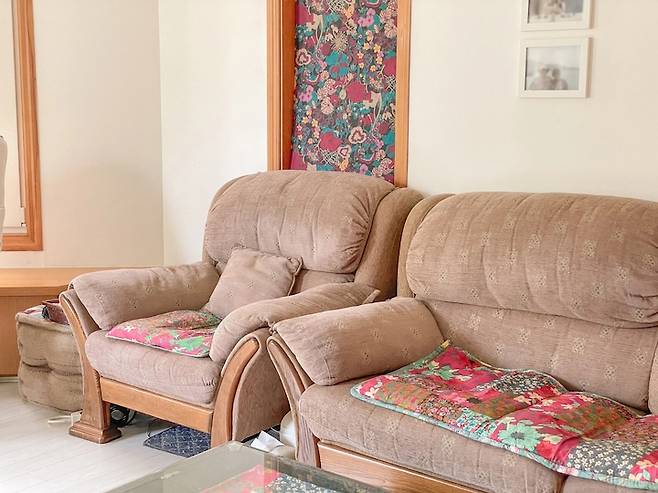소파 뒤에도 창문이 있는데 아무래도 단독 주택이 소음과 외풍으로부터 취약하다 보니 폼보드에 천을 덧대서 창문을 막았어요. 이 또한 저희 어머니의 솜씨 ! 소파는 20년 전 어딘가 백화점에서 사신 거 라고 하는데 워낙 오래돼서 부모님도 기억을 못하시네요..ㅠ