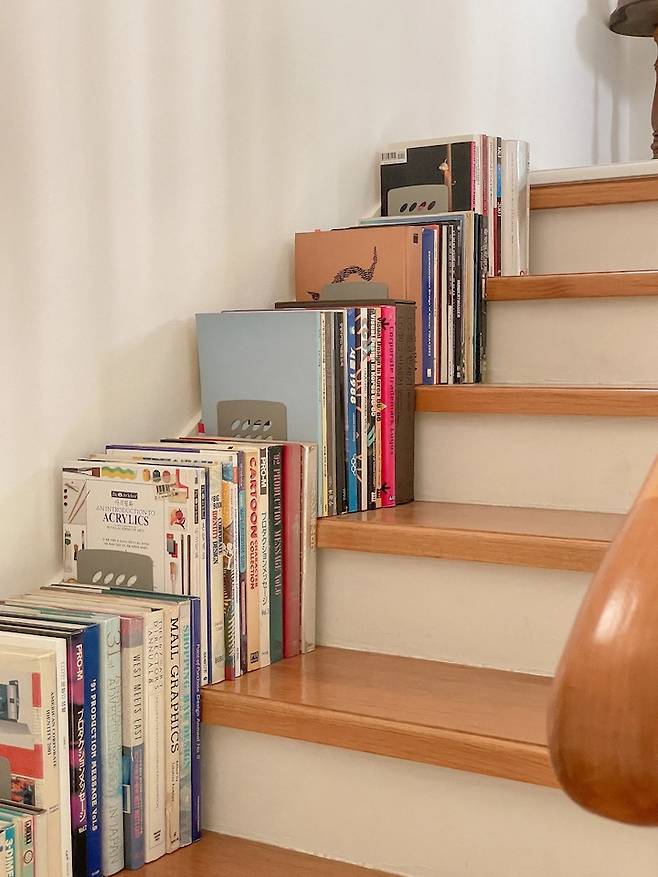 디자인서적이라 책표지도 이쁘고 나름 인테리어 같지 않나요!ㅎㅎ 계단 올라가다가 힘들면 계단에 앉아서 아무 책이나 뽑아서 읽곤 해요.
