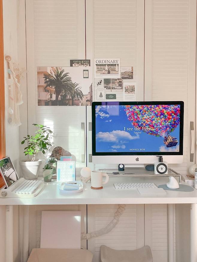 그리고 아무래도 데스크톱이 27인치이다 보니 큰 면적을 차지하는데 배경 화면만 바꿔줘도 방 분위기가 달라져요. 요즘은 유튜브 플레이리스트 배경이 너무 이뻐서 노래도 틀어두고 이쁜 배경도 띄워두고 일석이조입니다.