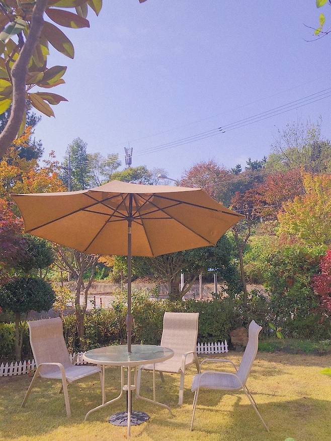 마당에는 파릇파릇한 잔디들과 편안하게 앉아서 휴식을 취할 수 있는 파라솔 테이블이 있는데요, 날씨 좋은날엔 나와서 식사를 하기도 해요. 다만 여름밤에는 모기들과의 전쟁인게 함정..!