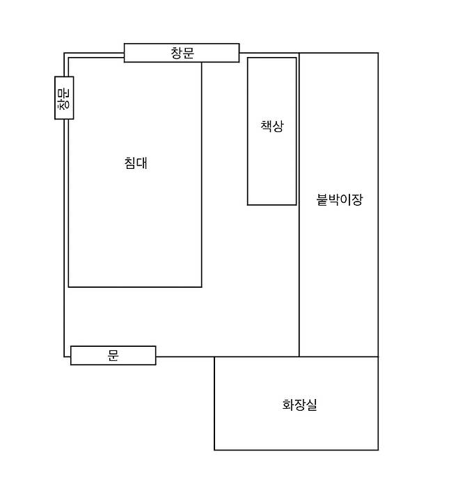 제 방은 방 구조가 가구 배치하기 애매한 구조인데요, 한쪽 면엔 붙박이장, 다른 한쪽 벽엔 문 2개 그리고 다른 벽들에 창문 1개씩 있는 애매한 구조 때문에 가구 배치가 어렵더라구요. 그 와중에 가끔씩 본가에 내려오는 언니와 함께 자려면 퀸 사이즈 침대도 포기할 수 없었어요. 우선 제 방을 먼저 소개 드릴게요!