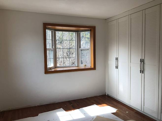 아무래도 부모님과 같이 사는 집이다 보니 다른 공간들은 부모님의 취향과 저의 취향이 섞일 수 밖에 없었는데요, 방은 저만의 감성으로 꾸며보았습니다. 우선 방 비포 사진입니다! 바닥 마루만 어두운 나무색에서 깔끔한 화이트톤으로 바꾸고 전체 벽면은 곰팡이와 결로를 방지하기 위해 규조토 페인트로 칠했어요.