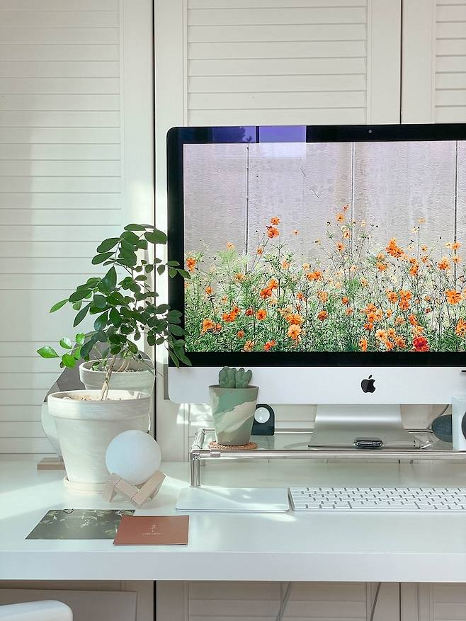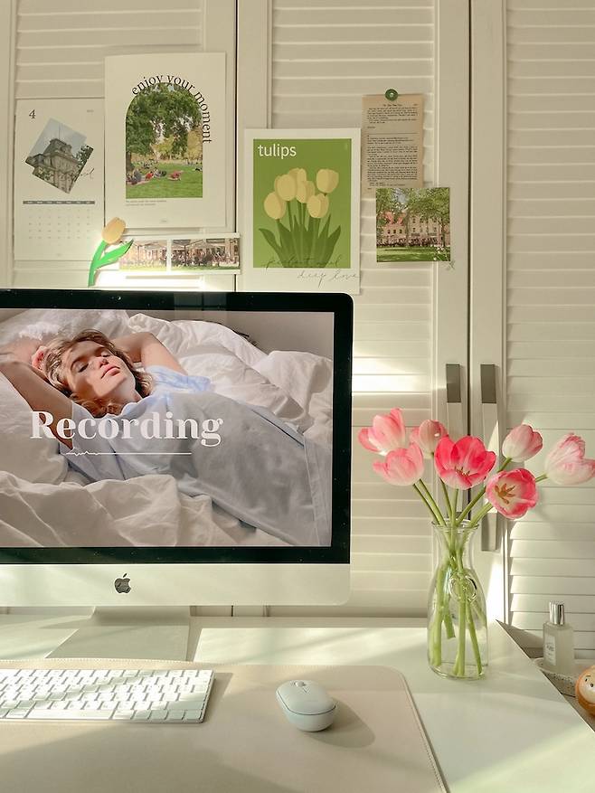 그리고 아무래도 데스크톱이 27인치이다 보니 큰 면적을 차지하는데 배경 화면만 바꿔줘도 방 분위기가 달라져요. 요즘은 유튜브 플레이리스트 배경이 너무 이뻐서 노래도 틀어두고 이쁜 배경도 띄워두고 일석이조입니다.