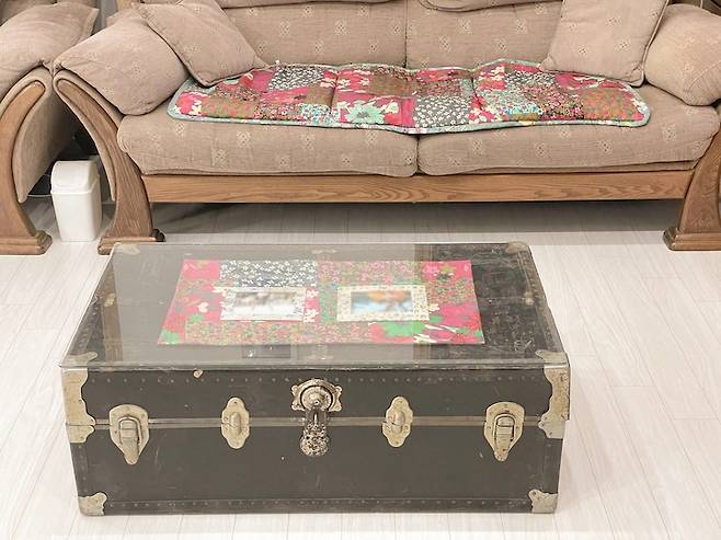 거실 테이블로 쓰고 있는 오래된 가구! 장안평 골동품 매장에서 구매한 고가구에 맞춤 유리를 놓아서 수평을 맞추고 테이블로 사용하고 있어요. 유리 안쪽에는 어머니께서 직접 만드는 테이블보와 가족사진이 들어 있답니다! 나름 높이도 적당하고 사이즈도 넉넉해서 TV보며 밥먹을 땐 여기서 먹곤해요.