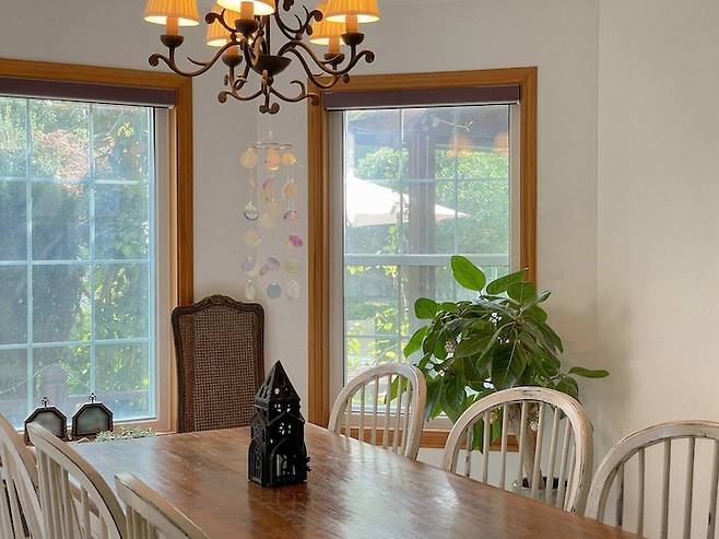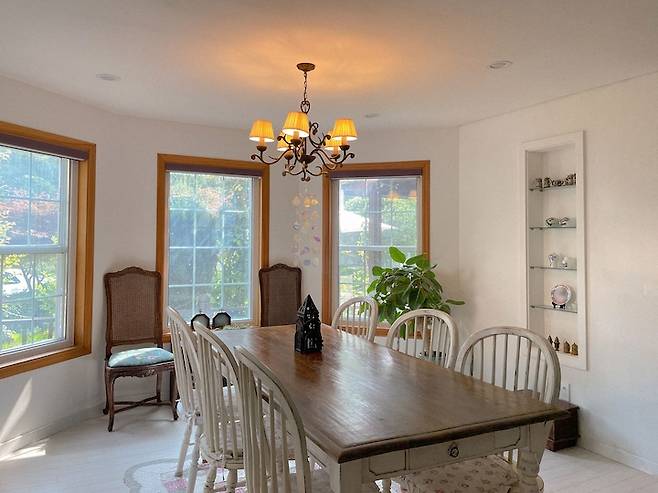 그 다음은 다이닝룸을 소개해드릴게요. 거실 다음으로 좋아하는 이 공간은 창문이 둘러싸고 있고 천장이 높아서 답답함 없이 시간을 보낼 수 있어요.