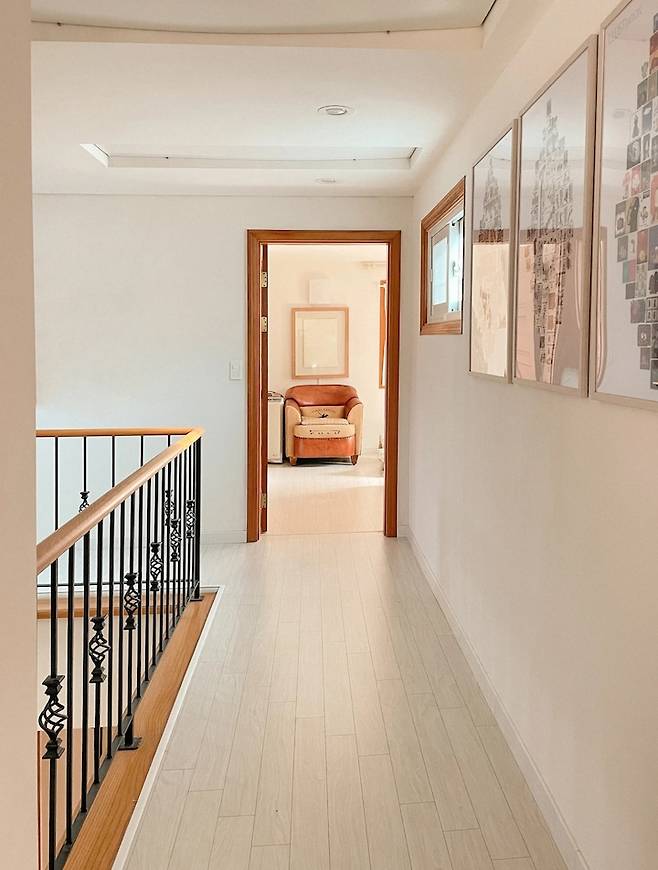 난간과 통일된 컬러로 붙여주어 원래부터 있던 것 같죠! ㅎㅎ 저희 집엔 여기저기 가족사진이 정말 많답니다.