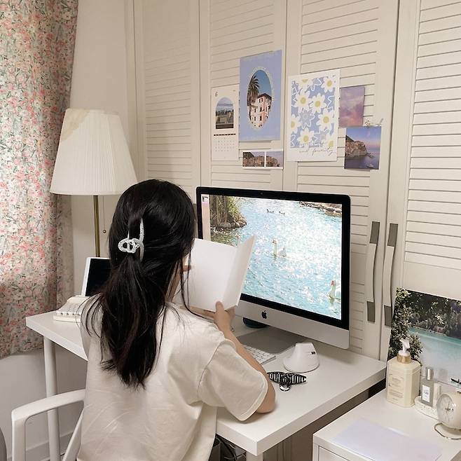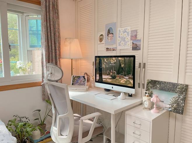 책상과 데스크톱은 서울에서 자취할 때부터 쓰던건데 본가의 화이트톤 방과 잘 어울릴 것 같아서 들고 왔어요. 처음엔 어떤 것부터 꾸며볼까 고민했는데 벽에 포스터와 엽서를 붙이는 것부터 시작했어요.