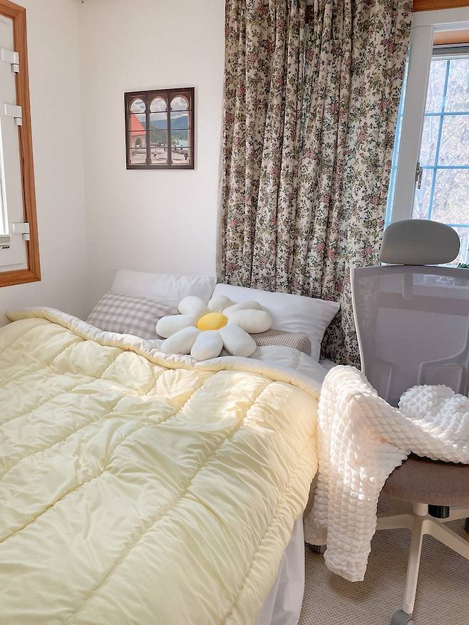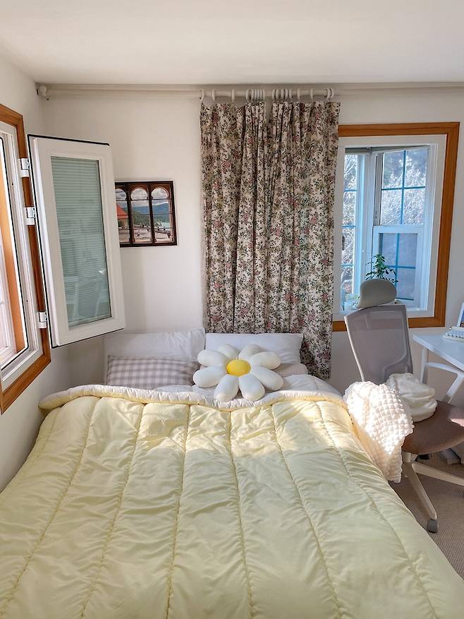 봄에는 노랑노랑한 침구로 바꿔서 산뜻한 느낌을 내주었어요. 침구에 따라 느낌이 정말 확 바뀌죠?