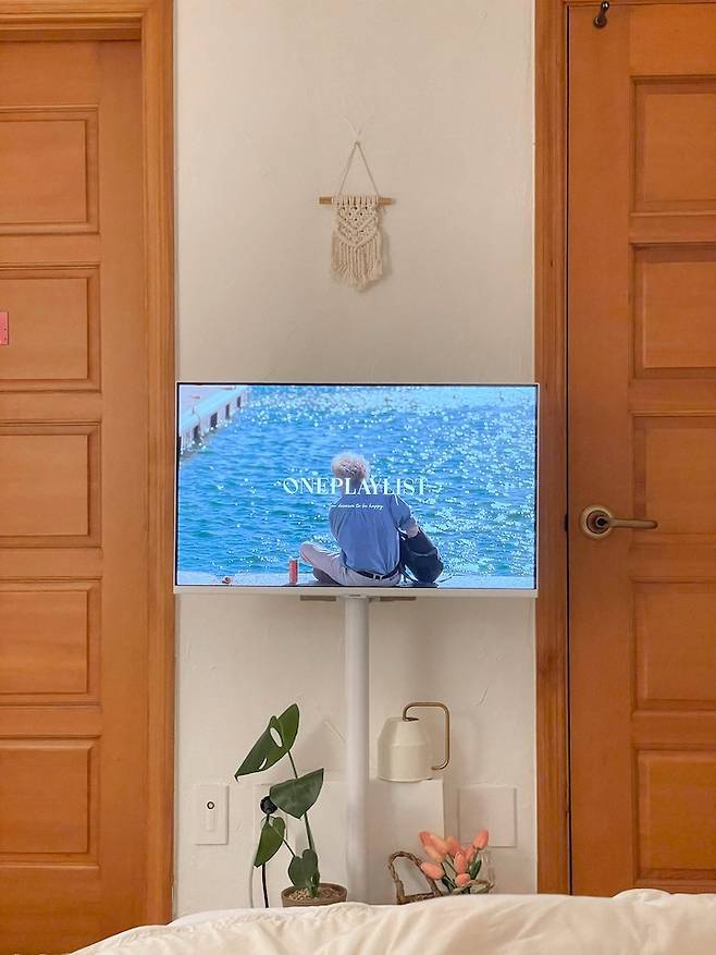 침대에 누웠을 때 보이는 모습이에요. 양쪽 문2개와 가운데에는 삼텐바이미! 왼쪽문은 화장실, 오른쪽문은 방문인데 딱 가운데에 티비를 두니까 좋더라구요. 엘지 스탠바이미는 너무 가격대가 부담되서 삼성 스마트모니터와 거치대를 구매해서 삼텐바이미로 만들었어요.