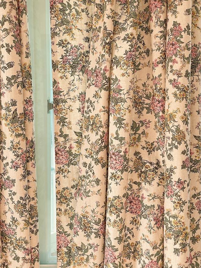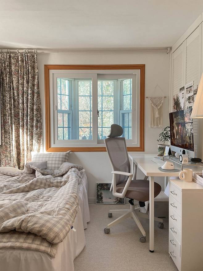 그래서 따뜻한 느낌이 드는 베이지톤의 체크 침구로 바꿔줬어요. 순면이라 너무 보드랍고 폭신해서 만족하는 중이에요. 커텐도 원래 그레이톤의 롱 암막 커튼이었는데 빈티지한 플로럴 패턴의 짧은 커텐으로 바꿔줬어요.