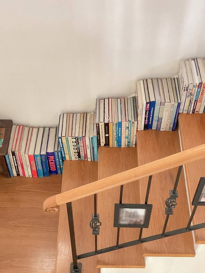 계단에는 디자인 관련 서적들을 쭈욱 꽂아뒀어요. 이번에 아버지께서 퇴직하시면서 직장에 있던 책들을 다 집으로 갖고 오셨는데 마땅히 둘 곳이 없어서 고민하던 중 계단에 쭉 놨어요.