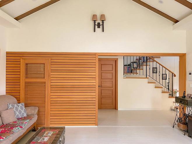 큰 창의 맞은편은 이렇게 되어있어요! 2층으로 올라가는 계단과 복도가 보입니다. 저희 집의 방석과 천들은 모두 어머니의 취향이 묻어있어요.
