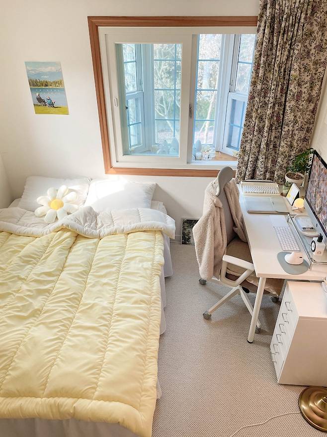 귀여운 데이지 쿠션으로 포인트를 주구요, 분위기 좋은 포스터 달력도 붙여주면 저만의 감성방 완성 :)