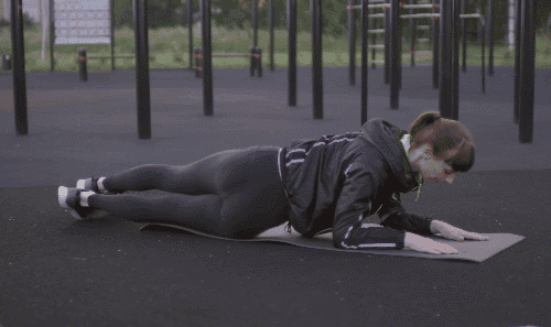 팔꿈치 플랭크 자세를 유지합니다. 엉덩이를 오른쪽으로 내렸다가 원래 자세로 돌아옵니다. 이번에는 왼쪽으로 내렸다가 다시 돌아옵니다. 엉덩이를 좌우로 반복하여 움직입니다.