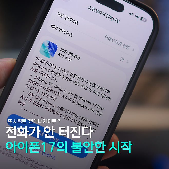 아이폰17에는 새 운영체제 iOS26이 들어갔죠. 애플은 출시 직후부터 통신 문제 제보가 쏟아지자 급하게 iOS26.0.1 업데이트를 내놨습니다. "이걸로 해결됐다"고 생각했지만... 막상 써보니 달라진 게 없다는 반응이 훨씬 많습니다. 전화 끊김은 여전하고, 카카오톡이 늦게 오기도 하고, 심지어 자동차 '카플레이' 연결도 불안정하다는 말이 많습니다.