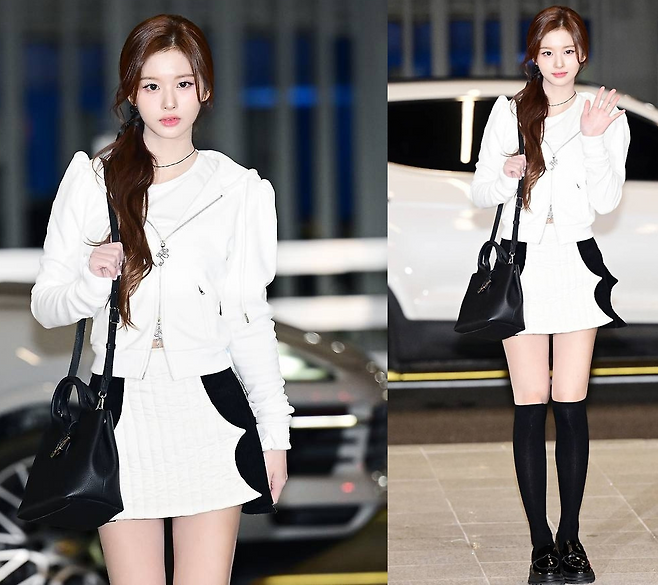 설윤은 화이트 후드와 검정 배색 디테일이 돋보이는 미니스커트 셋업에 깔끔하고 고급스러운 블랙 컬러의 핸들백을 매치해 사랑스러운 겨울 패션을 선보였습니다.