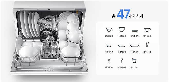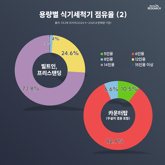 제품 유형별로 살펴보면 뚜렷한 차이가 드러난다. 빌트인과 프리스탠딩은 대체로 12인용과 14인용 같은 대용량 모델이 중심이며, 전체의 70% 이상을 차지한다. 특히 최근 14인용 비중이 빠르게 커지면서 빌트인·프리스탠딩은 사실상 ‘대가족 전용 가전’이라는 인식을 강화했다.