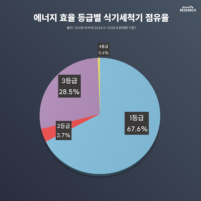 식기세척기의 에너지 효율 등급 분포를 보면 1등급 제품이 67.6%로 가장 많다. 하지만 이는 소비자 선택이라기보다 시장에 출시된 제품 구조 자체가 그렇게 형성돼 있기 때문이다. 빌트인이나 프리스탠딩 모델은 해외 일부 브랜드를 제외하면 대부분이 1등급으로 출시되기 때문에 점유율이 높게 잡힌다.