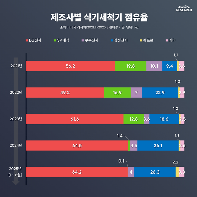 식기세척기 시장은 불과 몇 년 사이 뚜렷한 재편 과정을 거쳤다. 먼저 LG전자는 2021년 56.2%였던 점유율을 2025년 64.2%까지 끌어올리며 꾸준히 1위를 지켰다. 빌트인과 프리스탠딩 대용량 제품을 중심으로 라인업을 강화하면서 ‘국민 식세기’ 이미지를 공고히 한 셈이다.