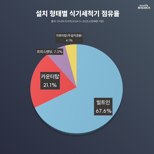 용량 선택의 흐름이 대용량 중심으로 재편되었다면, 설치 형태에서는 빌트인이 확실히 중심을 잡았다. 전체 시장의 67.6%가 빌트인으로, 주방 리모델링이나 신혼집 인테리어에서 ‘기본값’처럼 자리 잡은 모습이다. 외관을 깔끔하게 유지하면서도 14인용 같은 대용량 모델을 탑재할 수 있다는 점이 강점으로 꼽힌다.