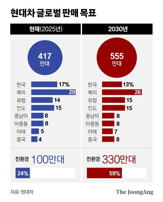 현대차의 반격 전략은 구체적이다. 올해 417만대인 글로벌 판매량을 2030년 555만대로 33% 늘리면서도 지역별 비중을 완전히 재편한다는 계획이다.