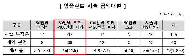 소비자원은 3년간 임플란트 피해구제 신청 179건 중에서 97건(54.2%)의 시술 금액이 100만원 이하라며 임플란트 건강보험 기준 금액(121만2천70원)보다 낮은 금액대 시술에서 부작용 등 피해가 상대적으로 많다고 강조했다.