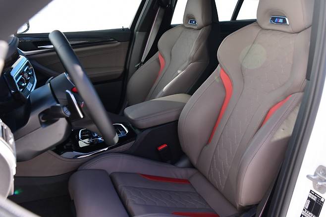 그러면서 풀 디지털 계기판과 와이드 디스플레이가 적용되며 나름대로 하이테크한 느낌도 살렸다. 그 외에 이 차는 일반 X4와 달리 고성능 M 모델임을 강조하는 포인트가 몇 군데 있는데, 우선 센터 콘솔 안쪽에 X4 M 레터링과 M이 음각된 기어 레버, 그리고 세미 버킷 시트, M의 삼색 컬러가 적용된 안전벨트 등이 있다.