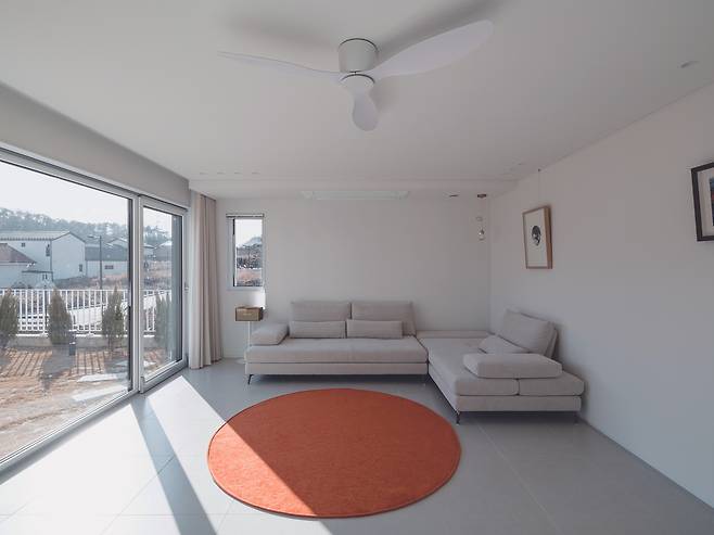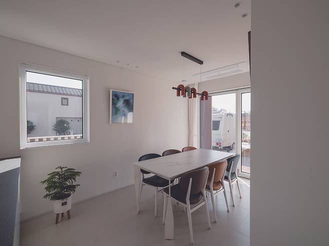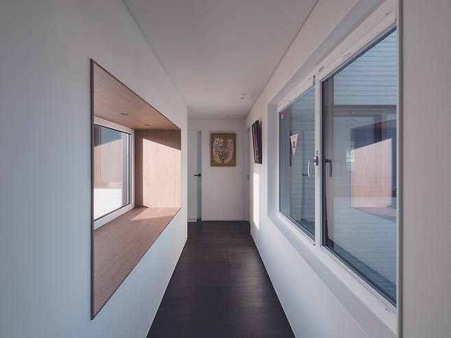1층은 거실과 주방을 완전히 분리해 독립된 두 개의 공간으로 구성했다. 두 공간을 연결하는 복도는 외부 풍경을 실내로 끌어들이는 역할을 한다. 복도 곳곳에는 욕실, 게스트룸, 중정으로 이어진 문 그리고 마당을 향한 큰 창이 배치돼 있다.