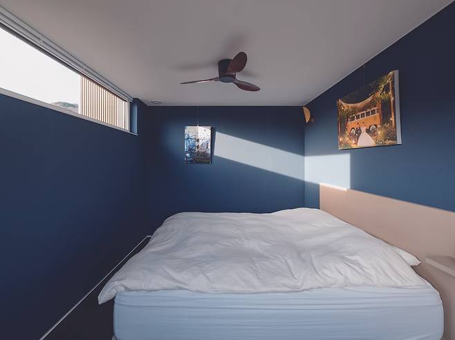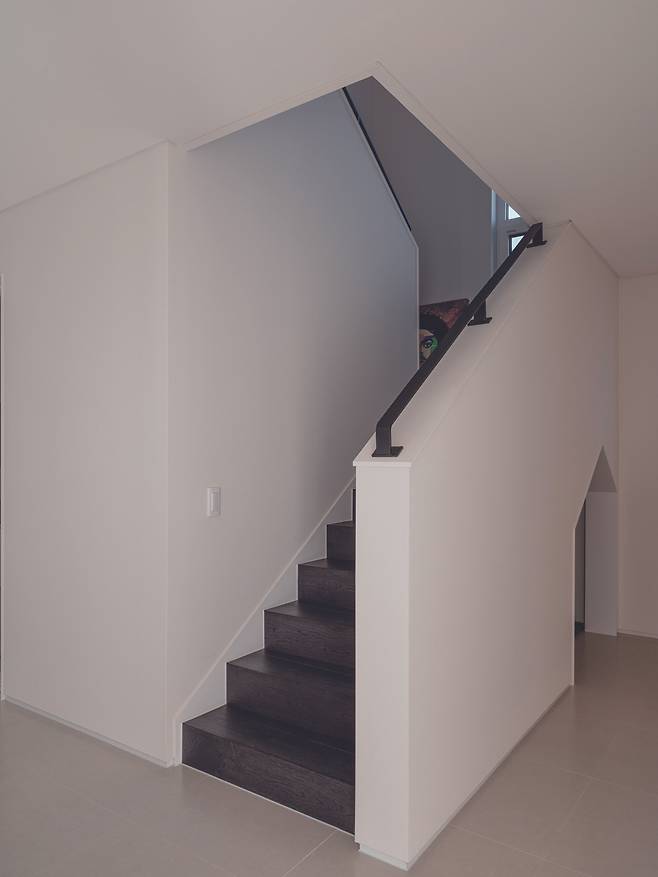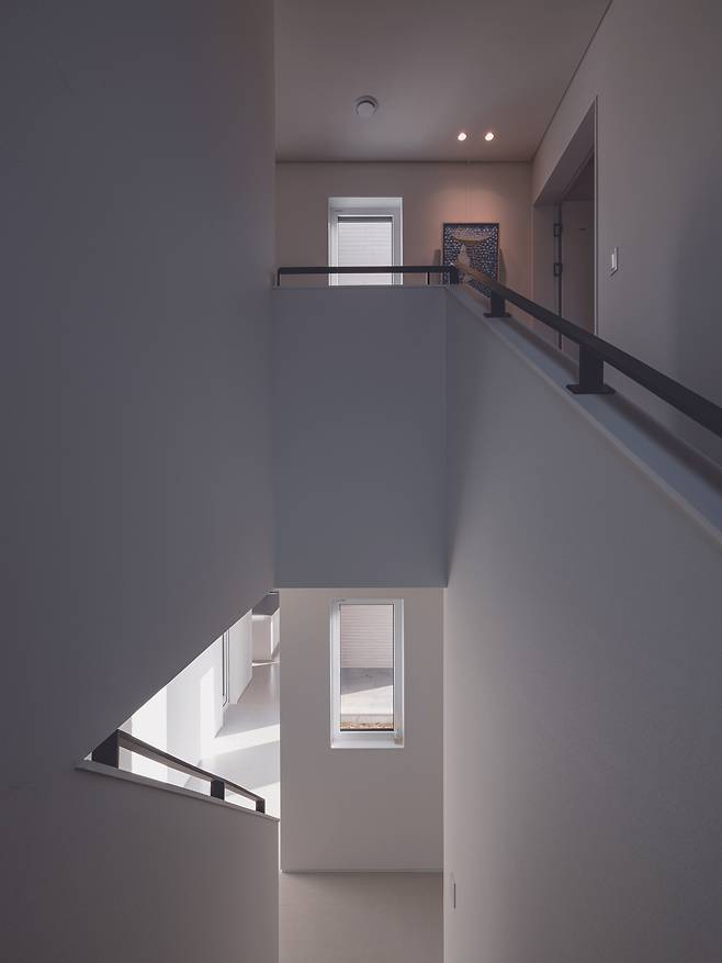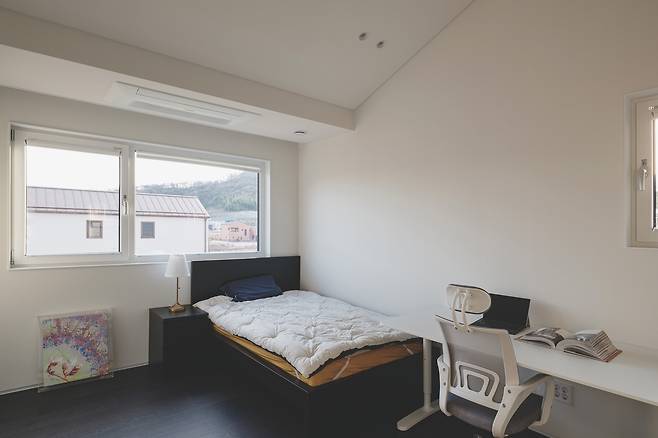 2층은 부부 침실과 두 개의 아이 침실 그리고 가족실로 구성된다. 모든 방은 남향 배치로 채광과 풍경의 유입을 극대화했다. 각 방에는 천장 중앙조명 대신 실링팬, 간접조명, 매입등을 활용해 부드럽고 은은한 조도로 계획했다. 복도 창가에는 두 사람이 누워 쉴 수 있는 너른 공간을 마련했고 아이 침실은 경사 천장을 살려 답답함을 덜었다. 공간과 자연의 변화를 직접 느끼며 자라는 아이들의 감수성이 풍성해지길 바라는 건축주의 마음이 담겨 있다.