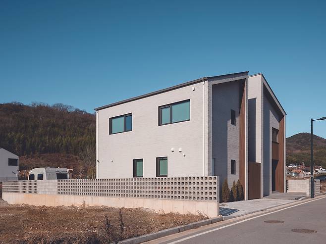 주차장은 ‘ㄴ’자 형태로 건물을 감싼다. 주차장이라고 전부 인공적인 콘크리트 포장으로 처리하기보다는 일정한 패턴을 두고 그 사이를 화산송이석으로 채웠다. 자연스러움을 더하기 위한 건축주의 작은 배려다. 담장은 큐블록과 평철 난간으로 구성하되 반복보다는 여닫음과 집중을 유도하는 디자인으로 계획됐다. 담장 덕분에 외부와 내부의 경계는 더욱 입체적이고 마치 하나의 풍경처럼 비친다.