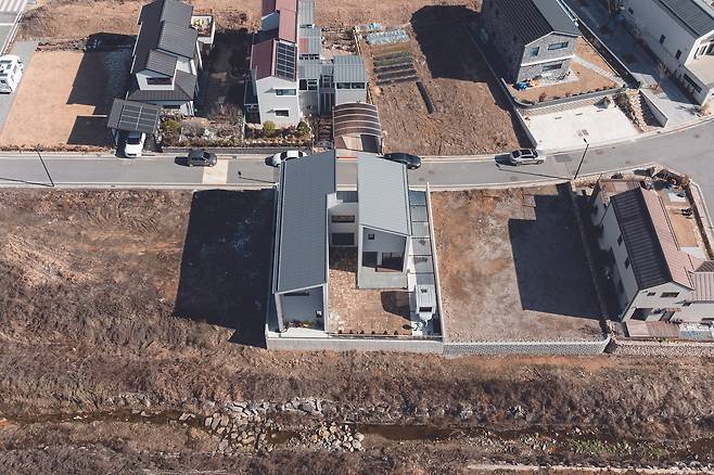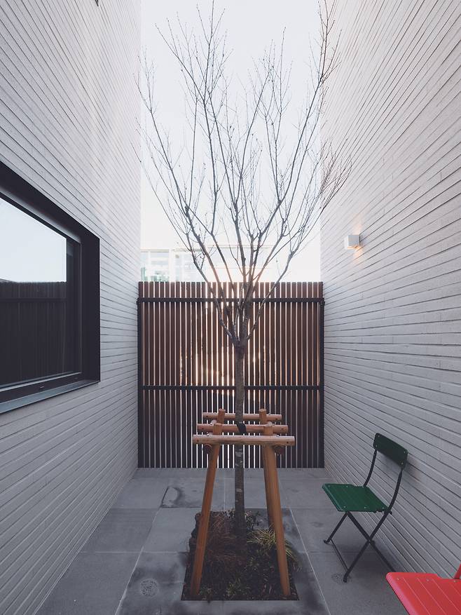 ‘태지가’는 H자형 평면으로 구성된다. 자연스럽게 형성된 두 개의 마당은 각기 다른 성격을 가진다. 앞마당은 주차장과 연결되며 바로 옆 개울과 멀리 보이는 대나무 숲의 산세를 담는다. 특히 캠핑을 즐기는 가족의 취향을 반영해 캠핑카를 위한 공간을 미리 계획해 마당 자체를 작은 캠핑장처럼 꾸몄다. 조경은 과하지 않으면서 꼭 필요한 곳에만 자연스럽게 배치됐다. 중정은 직립 느티나무와 수직 루버로 외부 시선을 차단하며 프라이빗한 공간으로 계획했다. 여름에는 그늘을 만들어 주고 게스트룸에서 바라보는 뷰를 완성한다.