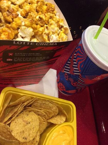 롯데시네마는 팝콘을 더 먹고 싶으면 새로 사야 하고, 할인도 따로 없어요.