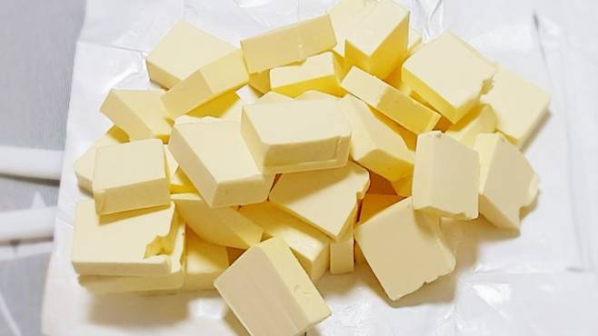 그럴 땐 바로 '종이포일'을 사용하면 되는데요. 종이포일을 조각 버터 크기에 맞춰 자르세요. 그리고 버터를 감싸 놓기만 하면 됩니다.