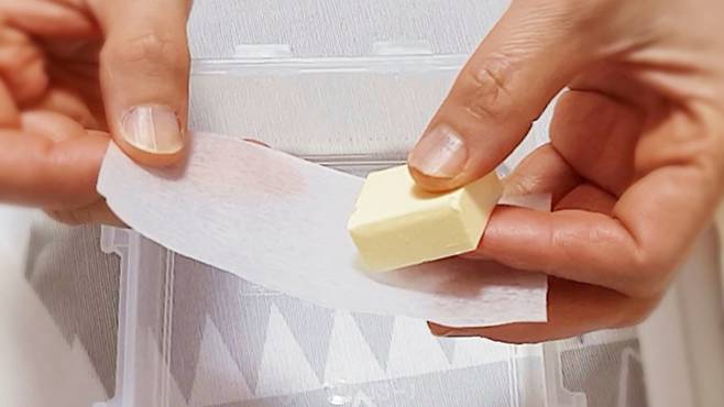 그럴 땐 바로 '종이포일'을 사용하면 되는데요. 종이포일을 조각 버터 크기에 맞춰 자르세요. 그리고 버터를 감싸 놓기만 하면 됩니다.