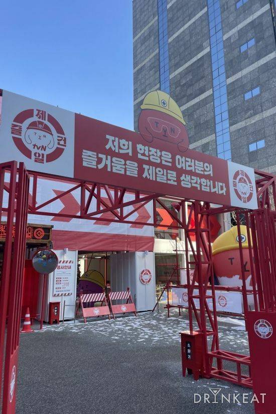 재밌는 드라마와 예능프로그램을 기획해 우리의 일상에 단비 같은 웃음을 전하는 tvN을 오프라인에서 만날 수 있다? 성수동 길을 지나다 보면, 절대로 지나칠 수 없는 분위기를 내뿜고 있는 이곳. ‘즐건제일’이라는 이름으로, 마치 건설 현장에 다다른 느낌을 발산해. 1층과 2층으로 구성돼 있는데 먼저 체험 공간인 2층에 갔어.