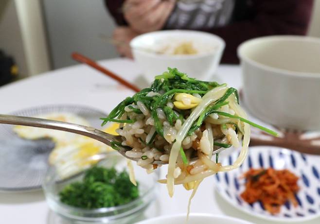 2. 세발나물의 아삭함과 고추장의 매콤함이 어우러져 색다른 비빔밥을 맛볼 수 있습니다.