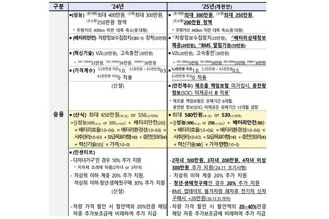 세부적으로 주행거리가 440km 미만인 차량은 보조금 감소폭이 늘었다. 충전 속도 인센티브 지급 구간도 상향됐다. 배터리 안전성 제고를 위해 기존 차량정보수집장치(OBDⅡ) 외에도 배터리 충전정보, 주차중 이상감지 및 알림을 제공하는 차량에 안전 보조금 총 50만원이 지원된다.