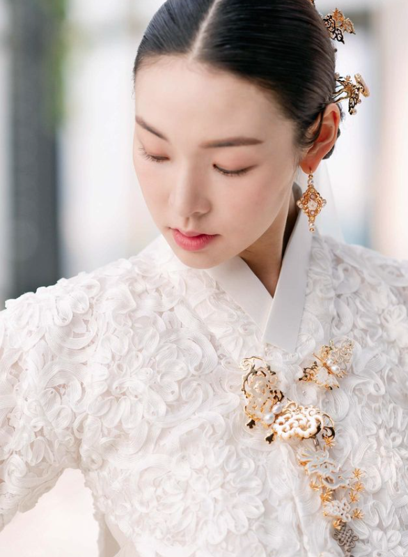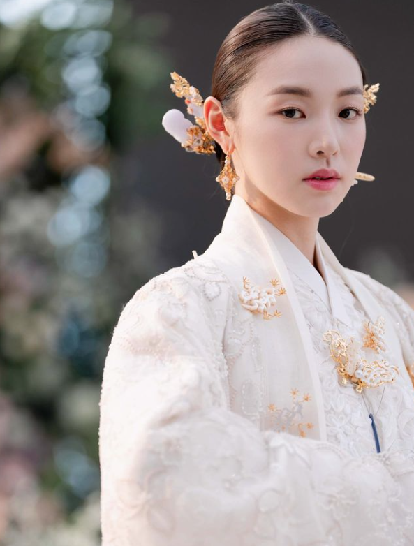 최미나수는 흰색 한복에 골드 장신구들을 매치해 고급스럽고 우아한 자태를 뽐냈습니다.