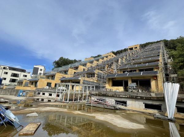 현재 ‘서미힐 테라스’는 총 28가구로 구성하는 2단지 공사가 중단된 채로 3년여 동안 방치된 상태다. 태양광 패널이 달린 주택마다 콘크리트 골조는 어느 정도 완성됐지만 내부는 텅 비어있고, 건설 과정에서 설치했던 철근과 파이프 등이 제거되지 않은 채로 빨갛게 녹슬어 있다. 현장 곳곳에 건설 자재가 널려 있어 마치 유령 마을같은 느낌이 물씬 난다.
