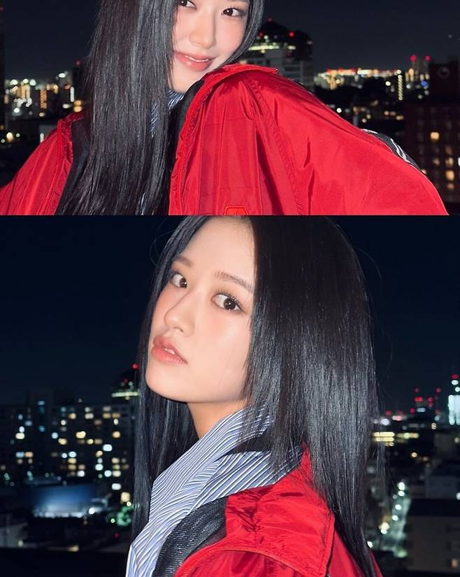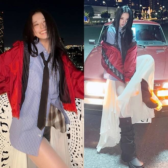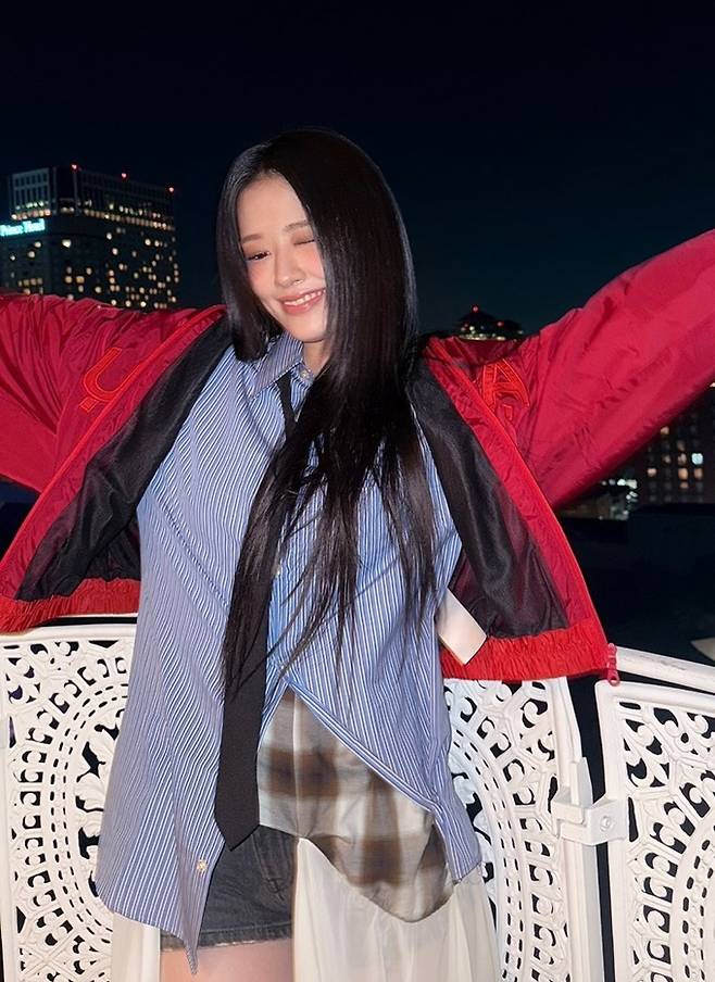 공개한 사진에서 안유진은 스트라이프 셔츠에 타이를 매고 빨간색 바람막이 재킷을 걸친 프레피룩으로 자유분방한 모습을 한껏 드러냈다.
