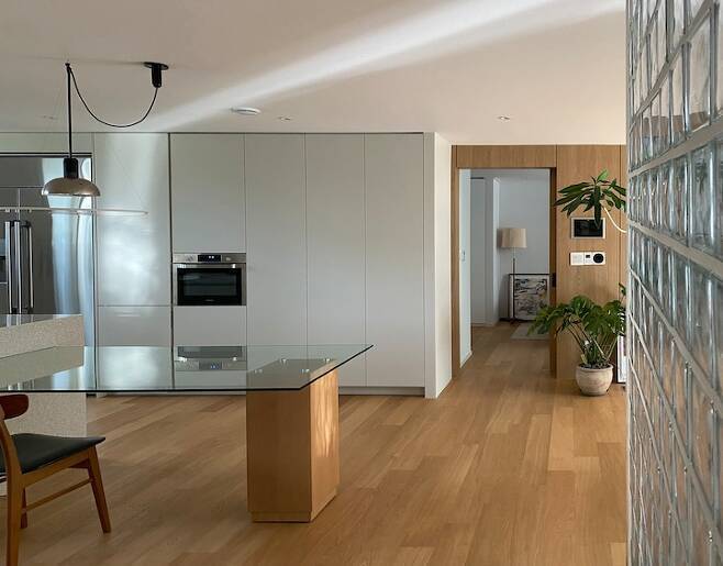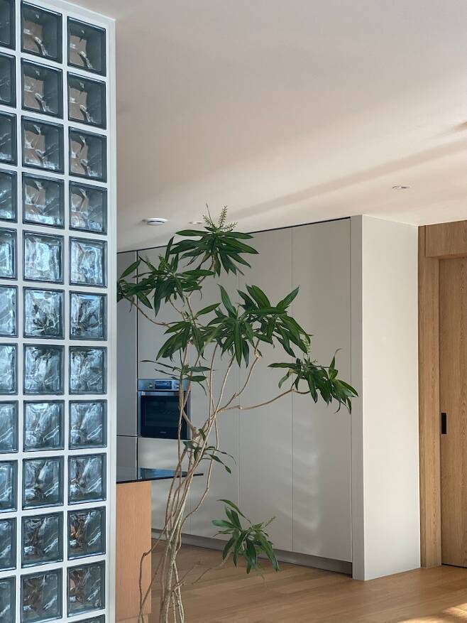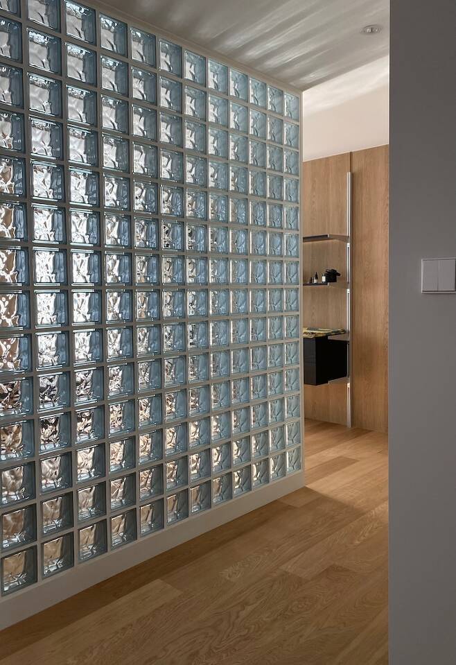 유리블록은 복도와 거실의 경계를 허물어 더 확장된 공간감을 주었고 은은한 빛을 집안 깊이 들여놓았습니다.