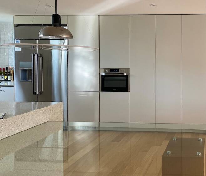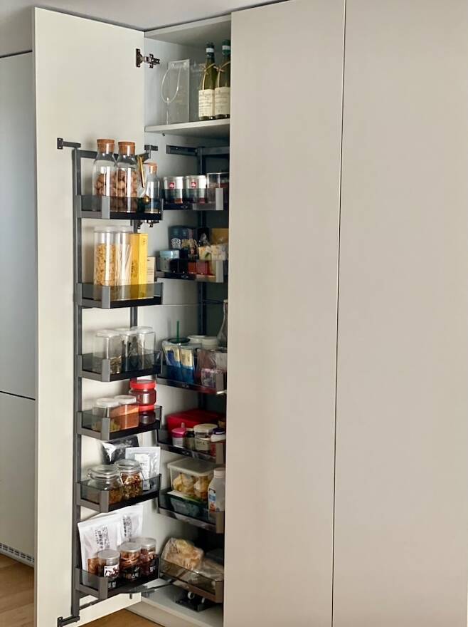 자칫 지저분해 지기 쉬운 공간이라 최대한 손잡이는 달지 않고 간결하게 푸시 도어를 사용했어요. 컬러감을 맞추어 최대한 단순하게 보이기 위해 노력했습니다. 하나의 장에는 팬트리를 별도로 설치하여 수납을 용이하게 했습니다.