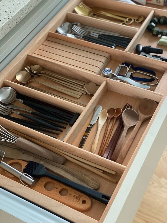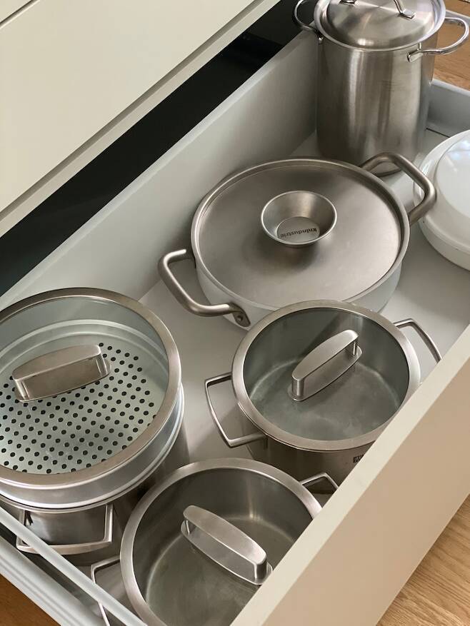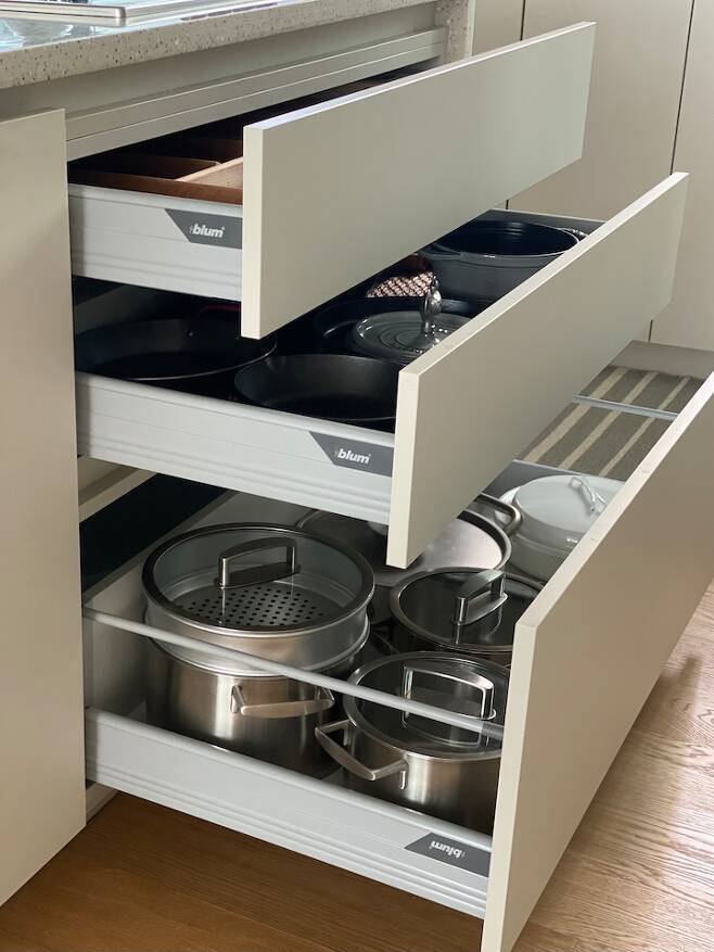 아일랜드 하부장에는 요리를 위한 조리 도구나 양념통, 냄비 등을 배치했습니다. 모든 하드웨어는 blum을 사용했고 조리도구와 냄비는 겹치지 않게 두어 꺼낼 때 편리하고 뒷정리도 쉽게 하였습니다.