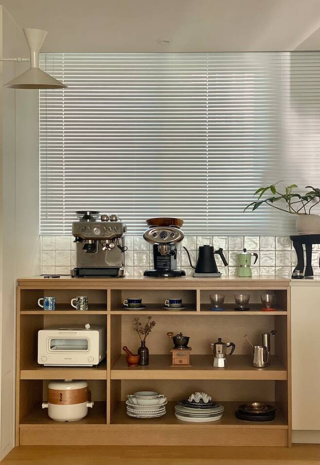 이 공간은 커피 머신을 생각하고 마련한 공간입니다. 조리대와 연결된 하부장으로 커피 외에도 어머님께서 주신 작은 절구, 선물 받은 커피포트와 그릇까지 수납하기 좋은 진열장이 되었습니다.